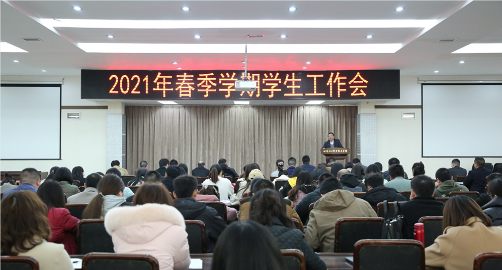 3月3日下午,学校在行政楼五楼会议室召开了2021年春季学期学生工作大会。学校副院长邓启华及各二级学院分管学生工作领导、学生处、团委、保卫处负责人、全校专兼职辅导员参加会议。大会由学生处副处长苏坤主持。