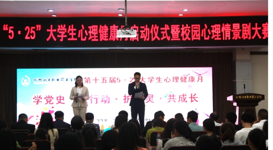 庆祝中国共产党成立100周年,持续推进心理健康教育工作,在全校营造关爱自我、重视心理健康的良好氛围,培养学生阳光心态,5月25日,学生处学生心理健康教育中心举行了第十五届“5·25”大学生心理健康月启动仪式暨校园心理情景剧大赛,院长助理谢光杰、学生处副处长邓子萍、学生处副处长苏坤、各二级学院分管学生工作领导、特邀评委、专兼职辅导员、学生代表参加了大会。