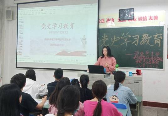 2021年4月21日,药品与环境工程学院学生党支部在综合楼A区307教室召开《中国共产党简史》--“红船精神”党史学习教育会。支部书记苏双双主持会议,在校学生预备党员8人参加本次会议。