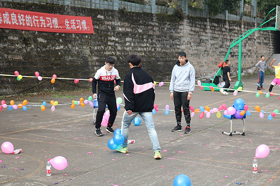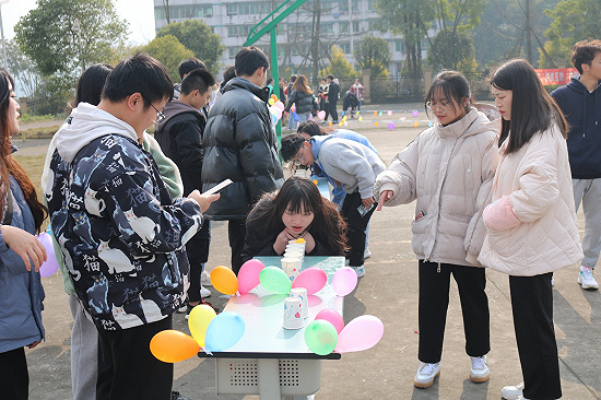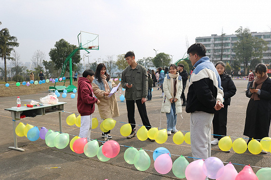 活动正式开始,活动项目丰富多彩:踩气球、双人夹气球、转10圈、指压板连续跳绳、我比你猜、套圈、抢凳子、两人三足等项目,迎来了众多同学的参与,各个游戏区域都有不少同学排队等待,现场秩序井然有序。整个篮球场都洋溢着同学们的欢声笑语。