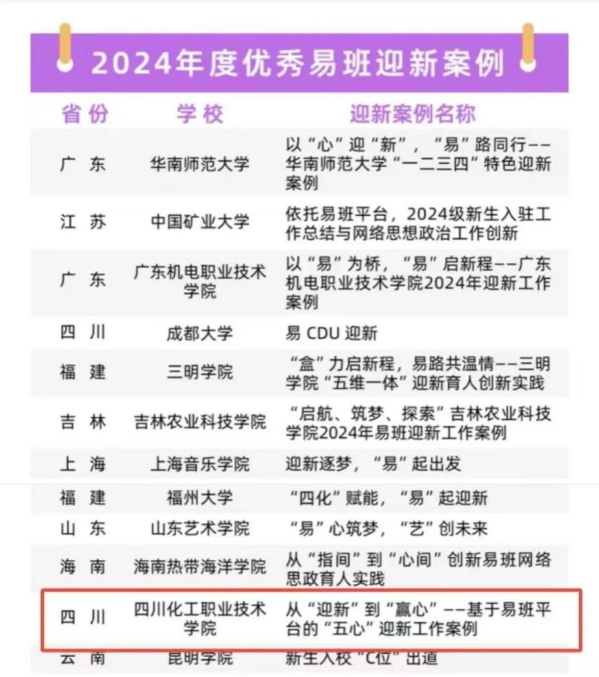 我校案例《从“迎新”到“赢心”——基于易班平台的“五心”迎新工作案例》荣获全国“优秀易班迎新案例”,学生处陈善娜老师获评全国“优秀易班指导教师”我校是全省唯一一所荣获2个奖项的高职院校。