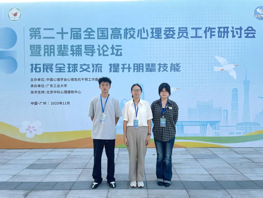 加强我校心理委员工作队伍建设,提升心理委员的自助与助人能力,我校学生心理健康教育中心贺娟老师带队参加第二十届全国高校心理委员工作研讨会暨朋辈辅导论坛,与来自全国的心理健康工作者共同探讨心理委员工作的新方法和新路径。本次研讨会由中国心理学会心理危机干预工作委员会主办,于2025年11月5—7日在广东工业大学召开,主题是“拓展全球交流,提升朋辈技能”。